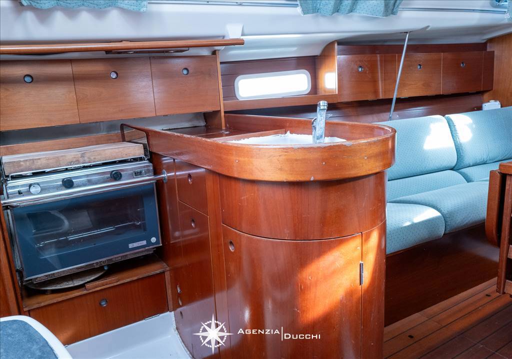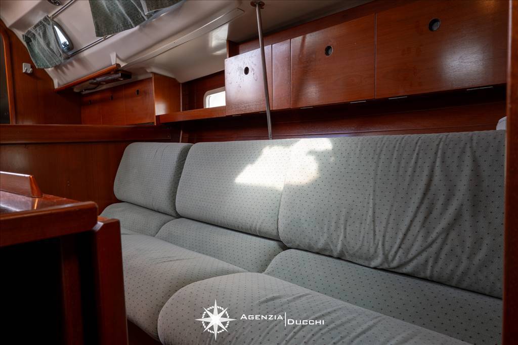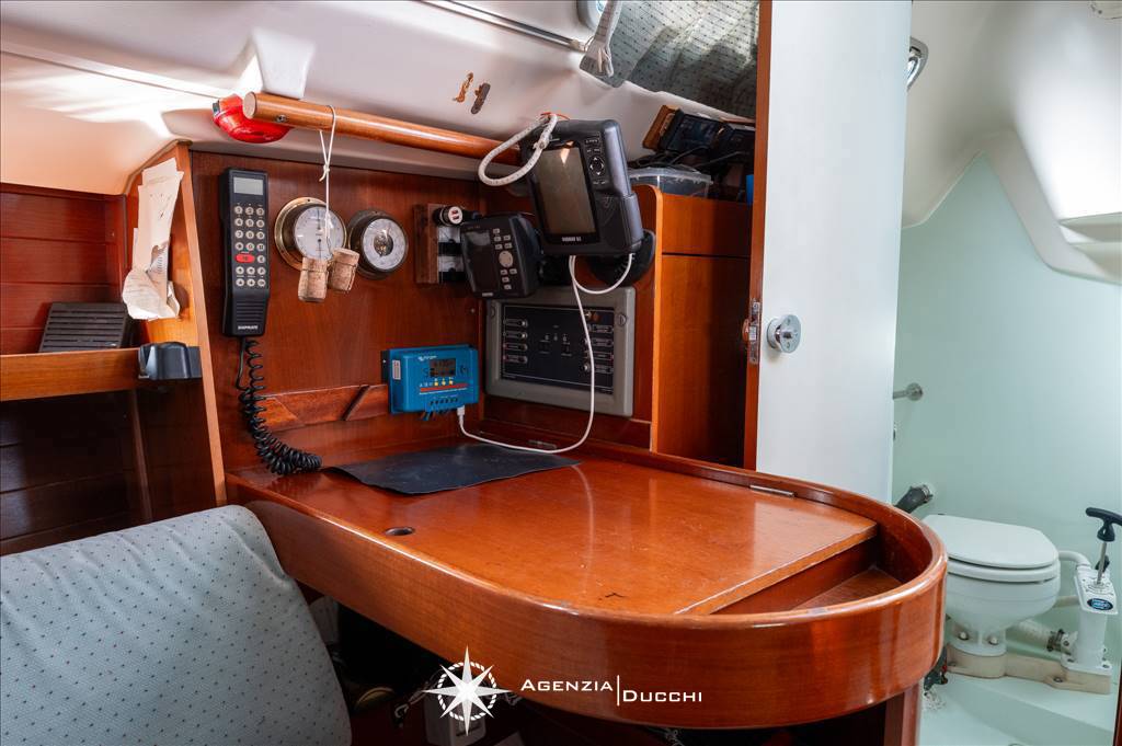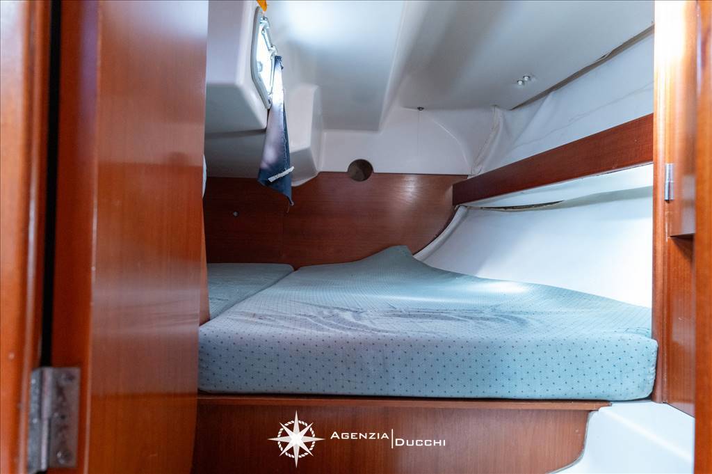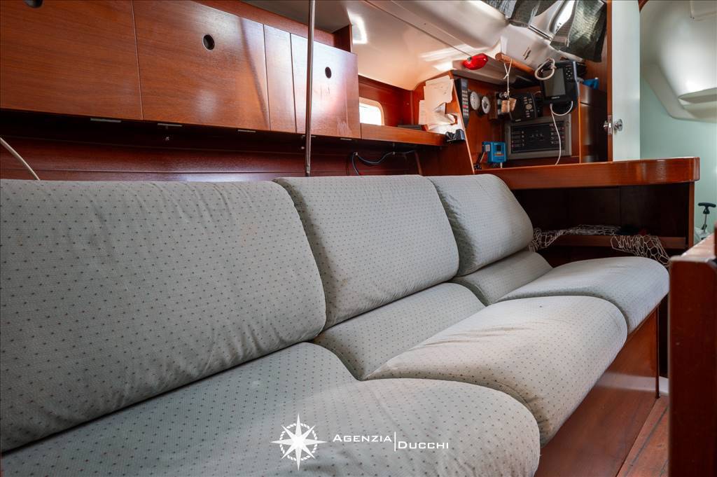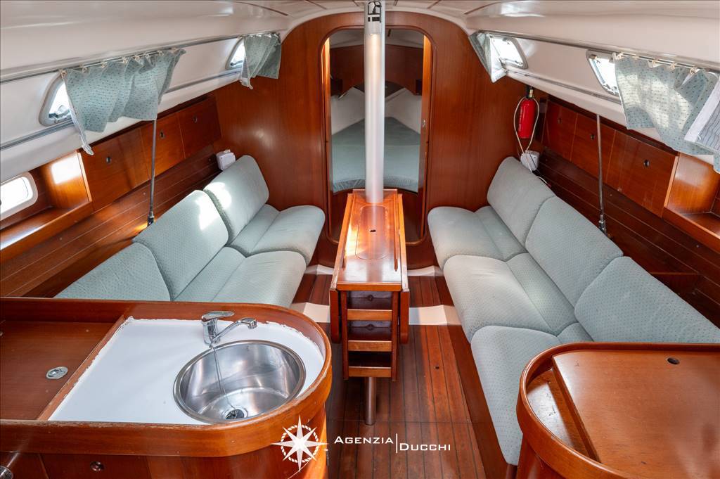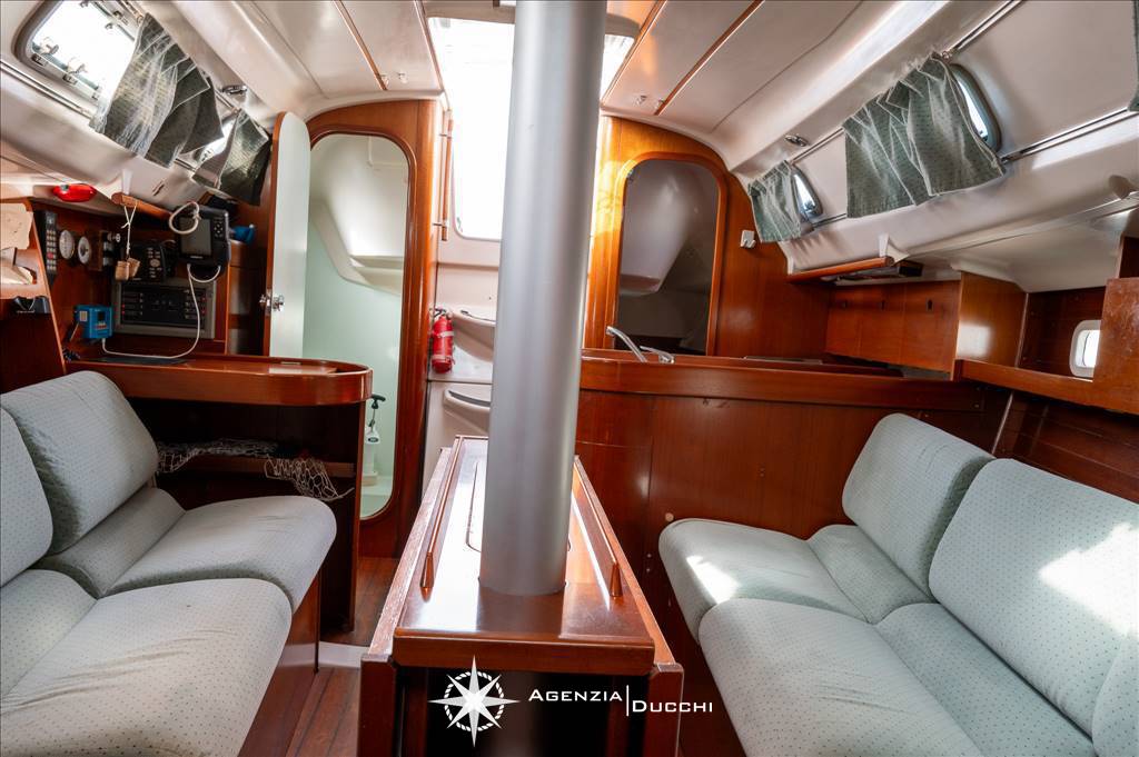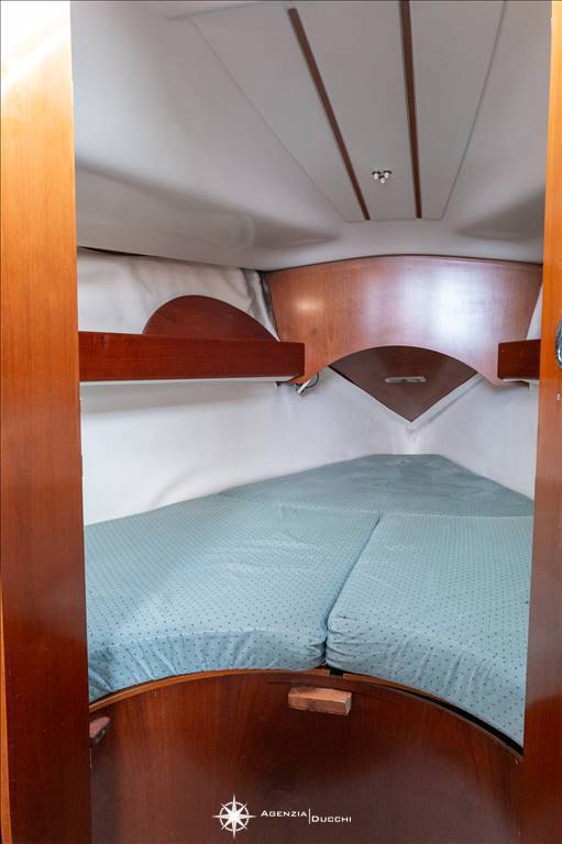 • dinette a divani contrapposti, cucina, carteggio, bagno, cabina a V di prua e cabina matrimoniale a poppa