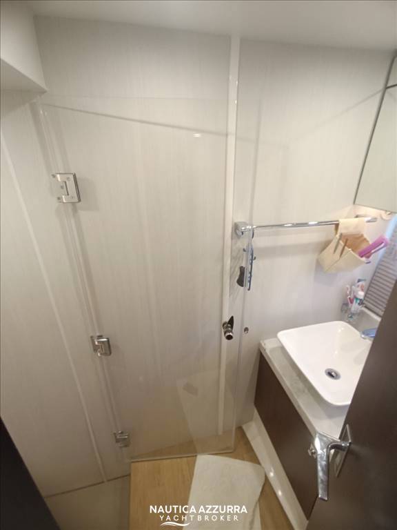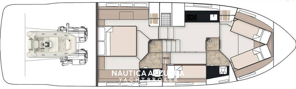 • Interni in noce - Versione tre cabine - Cucina attrezzata con piastra vetroceramica, frigo a colonna e dispensa scorrevole - Cabina armatoriale in centro barca con bagno ensuite - Cabina Vip a prua con letti singoli trasformabili in matrimoniale - Terza cabina con letti a castello - Bagno ospiti
