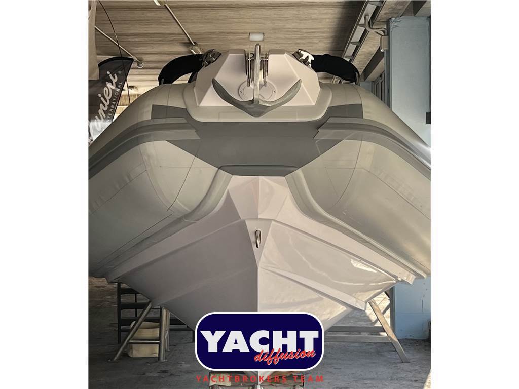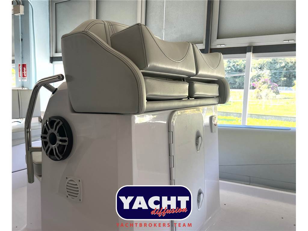 Sedile fronte consolle, Stand up di guida, Serbatoio carburante in polietilene reticolato, Stacca batteria, Tappezzeria esterna standard, Tavolo di poppa in King Starboard, Timoneria idraulica completa, Tromba elettrica, Tubolari bicolore Artic Grey / Inserti Lisci
